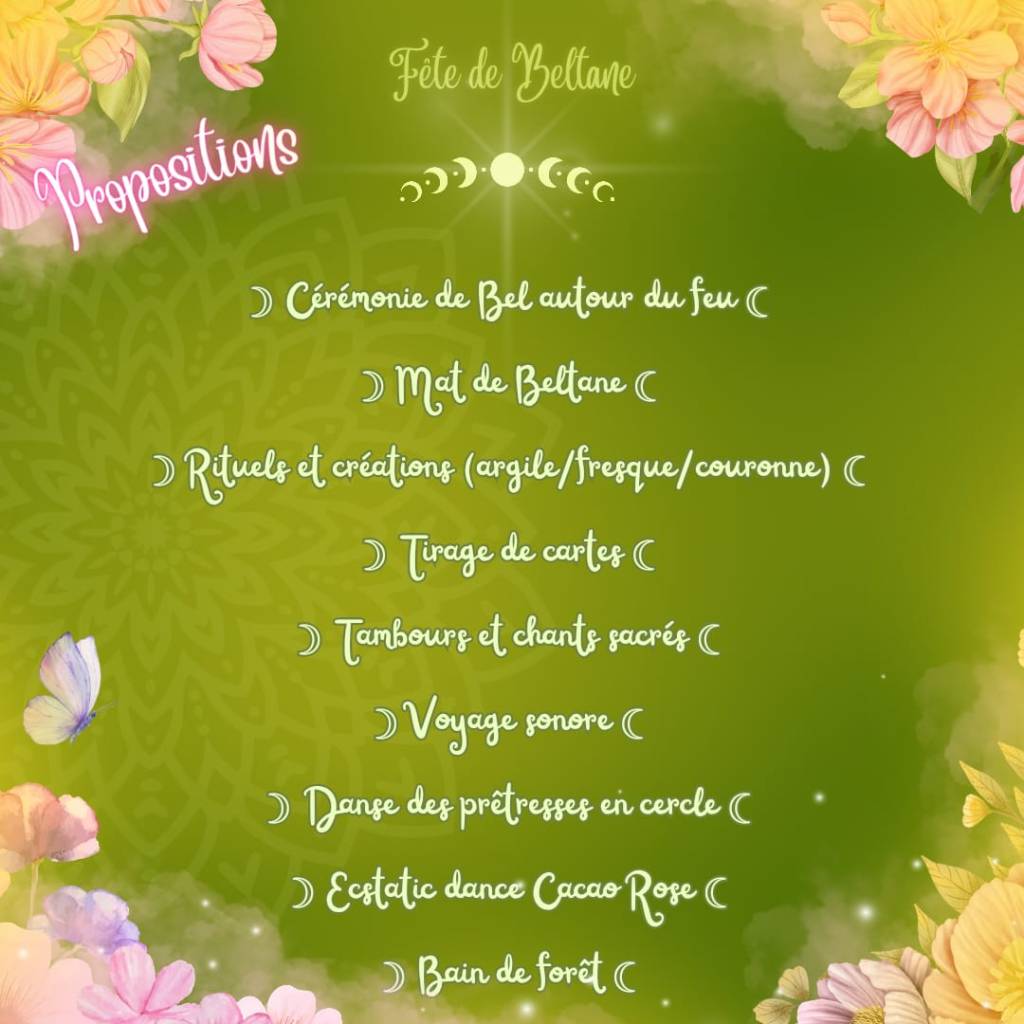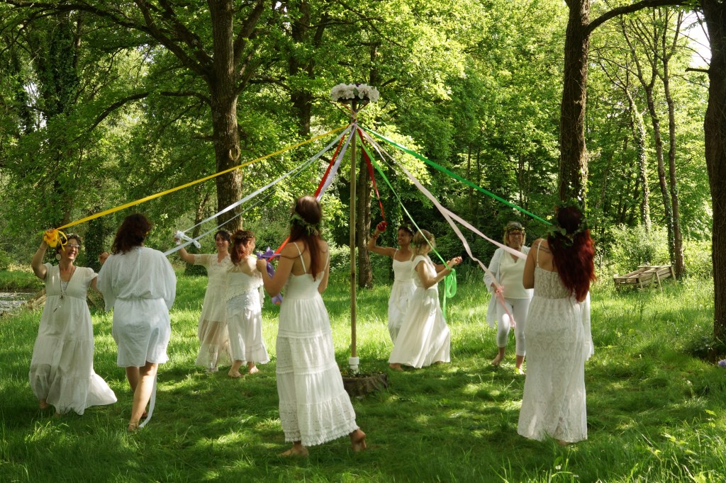 Lors de cette retraite, nous vous invitons à célébrer Beltane, un des huit sabbats qui composent la roue de l’année celte et se situe entre la sortie de l’hiver et le solstice d’été. Nous sommes dans la saison claire, au coeur du printemps, au coeur de nos éclosions. Nous célébrons le soleil qui grandit. Beltane signifie “Feu de Bel”, qui fait référence au Dieu Bel ou Bélénos, le Dieu Solaire. Entre femmes, nous célébrerons notre lumière, notre puissance, notre rayonnement et notre reliance à la nature. Beltane est une fête qui honore les devas de la nature (fées, gnomes, elfes). Nous dresserons un mât de Beltane et danserons autour en tressant des rubans comme le veut la tradition. L’arbre de mai est symbole de fertilité, de la vie qui jaillit. Que ce soit autour du feu ou autour du mât, c’est un sabbat où l’on danse pour célébrer la fertilité de la terre mais aussi pour appeler la protection, la santé et l’abondance. Chez les wiccans, ce sabbat représente l’union divine par le couple divin du Dieu et de la Déesse. La légende raconte que, après s’être accouplé avec la Déesse Mère Terre et l’avoir fécondé, Bel mourut pour renaître ensuite en tant que fils de la déesse. Cette retraite est donc aussi une invitation à embrasser nos parts féminines et masculines.