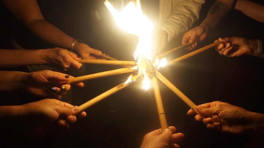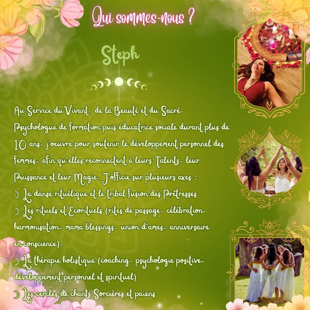 Pour qui ? Les femmes qui se sentent sorcières ou qui ont envie de reconnecter à cette facette d’elles-mêmes, se retrouver entre soeurs, faire tribu, se relier et ritualiser en cercle.